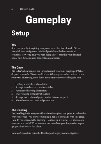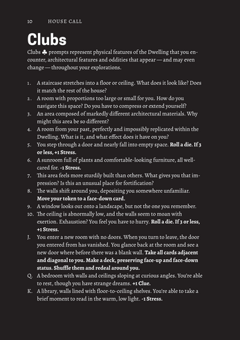 My first-ever TTRPG, written for THIS HOUSE WANTS TO BE EMPTY Jam! In this game, you're making a house call to a Dwelling where some strange things are happening. With just a deck of cards and a 6-sided die, explore inexplicable architecture and anomalous phenomena — and the people who (used to) live here.